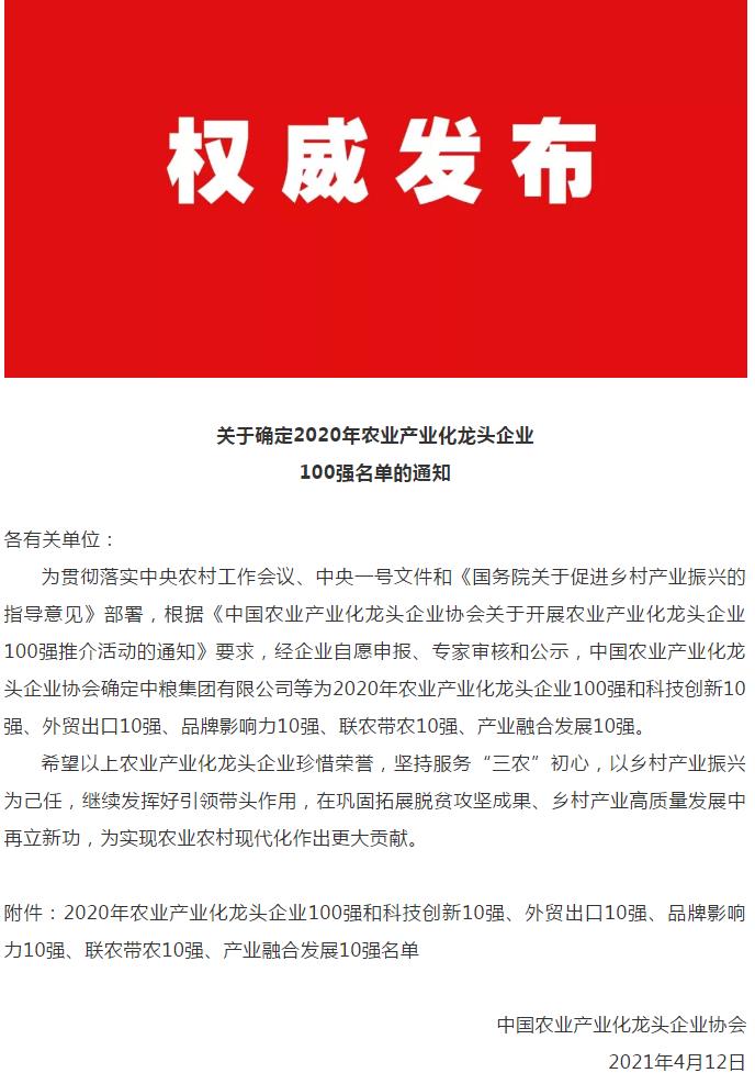 热烈祝贺汇福粮油集团荣获“2020年农业产业化龙头企业100强、品牌影响力10强”